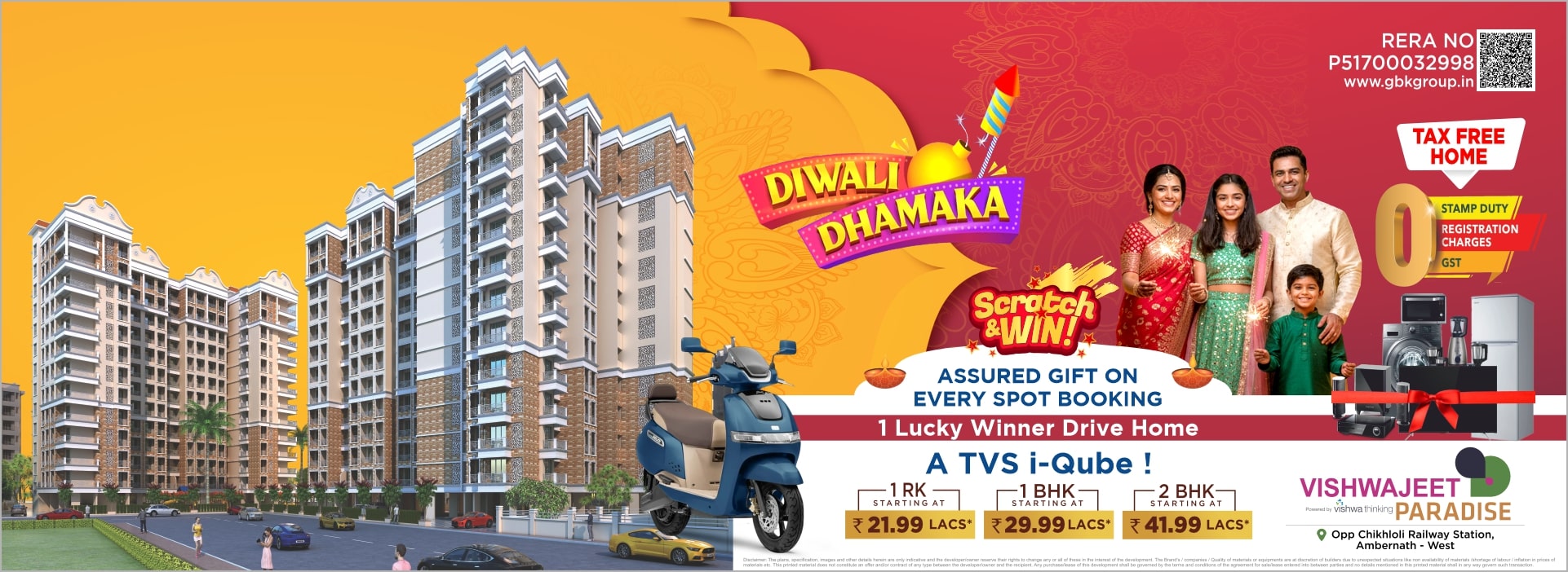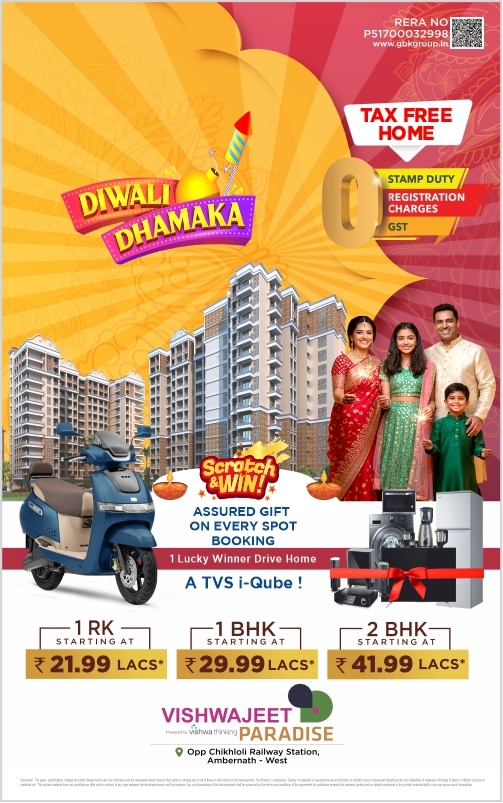 Vishwajeet Paradise is the integrated mega township in Chikhloli, Ambernath (West). Apart from introducing a unique living experience, homes here have been created with an eco-sense. This mega township is located at a prime location with all the amenities. Vishwajeet Paradise is made up of 2 Residential Towers, Stilt+12 floors having a Configuration of 1 RK, 1 BHK & 2 BHK Flats in Ambernath. A truly integrated township, Vishwajeet Paradise has close proximity to schools and colleges, market place, hospitals, and other vicinity like stations and highway